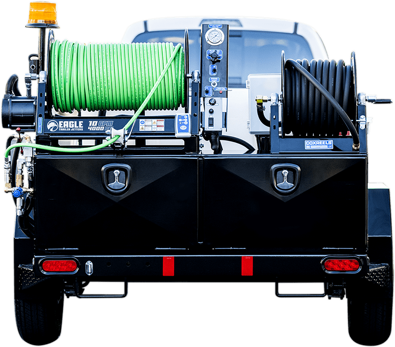 The Eagle 300 is a 20 GPM 4000 PSI, full-sized trailer jetter that includes a wireless remote control and swiveling hose reel. A unique double-power-plant design allows for multiple flow/pressure options, whether using the main jetter hose and nozzles or stepping down to a mini-hose/nozzle for smaller lines.